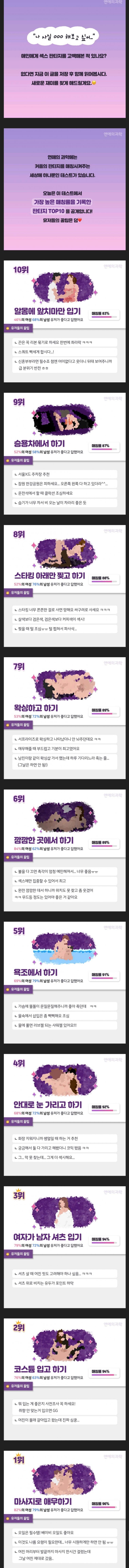 커플들이 가장 원하는 판타지 순위 존잘킹Dick 유머,Fun 19 2426 1 0 2022.11.08 01:28 1 0 Member Imformation 남성회원 4 0 Lv.1 존잘킹Dick 일반회원 864 (8.6%) 존잘킹딕 MY 블로그에 글이 없습니다.