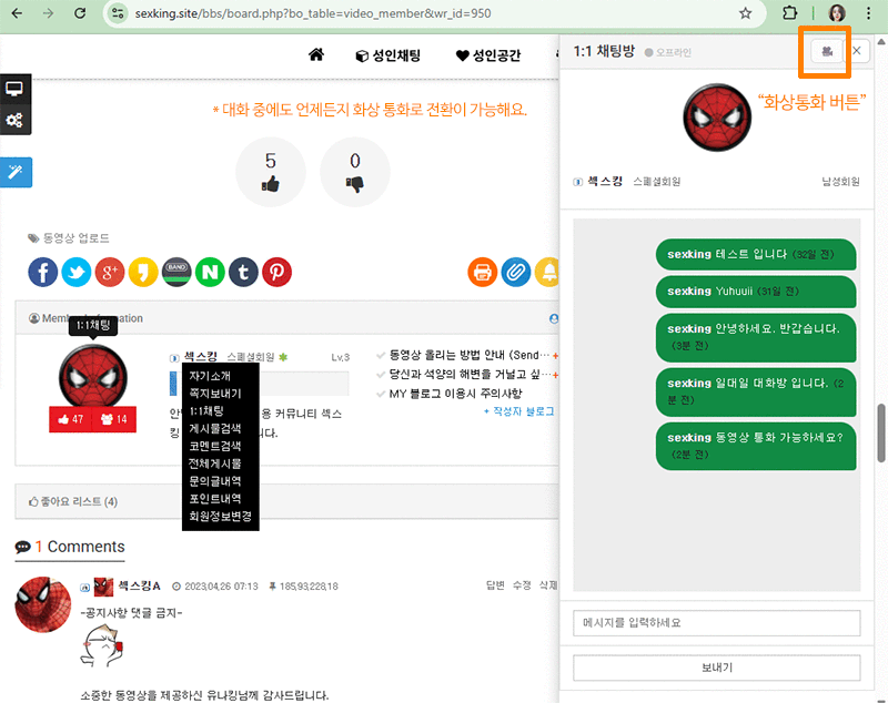 섹스킹 1:1화상 채팅 서비스 오픈 안내안녕하세요, 고객센터입니다. 드디어 1:1 채팅과 화상 통화 기능을 새롭게 선보이게 되었습니다!