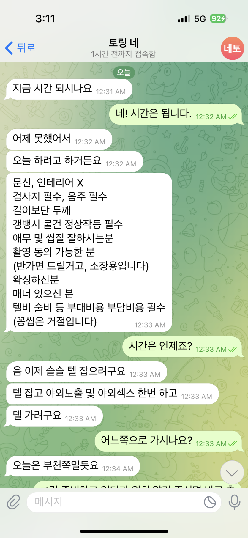 사건내역 : 이전에 갱뱅 플레이 한다고 하여 , 연락 주기로 함 이후 오전 12시넘어 플레이 가능 하냐고 텔레가 와서 가능 하다고하여 텔 잡으면 연락 준다고 하고 잠수 탐.