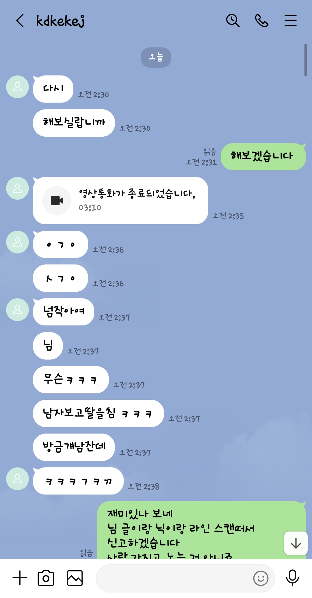 라인 영통으로 대화 하고 여자친구 자위 보여준다고 했는데 방을 어둡게 하고 먼저 보여주면 한다고 했는데 제꺼만 보고 속이고 속았다고 능욕하고 사람을 바보 취급하네요