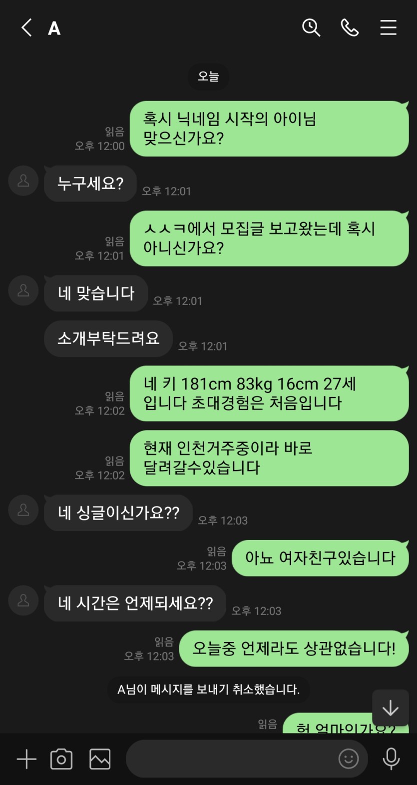 사건내역 : 당일에 라인으로 연락후 초대비 5만원과 사진요구, 장소 도착휴 내려간다는 말과함께 잠수