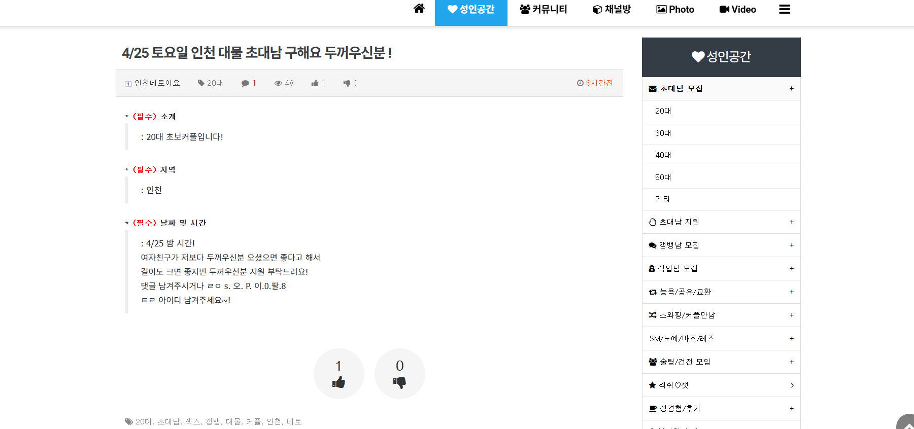 사건내역 : 이전 신고했던 동일인물이 아이디 닉네임만 바꿔 다시 초대모집글로 있지도 않는 초대만남 모집을 하고있습니다. 며칠 전에도 똑같은 패턴으로 사람들을 구해서 목적지에 도착했을때 잠수를 타며 섹스킹을 이용하는 회원들에게 시간적 물질적 피해를 주고있습니다.